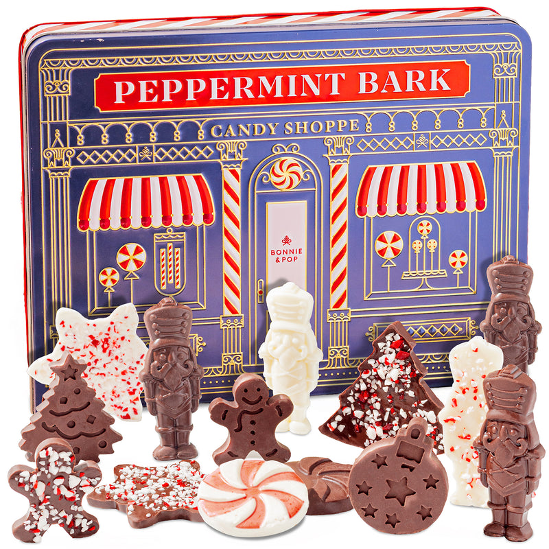 Christmas Gift – Peppermint Bark Gift Tin with Holiday-Shaped Chocolates